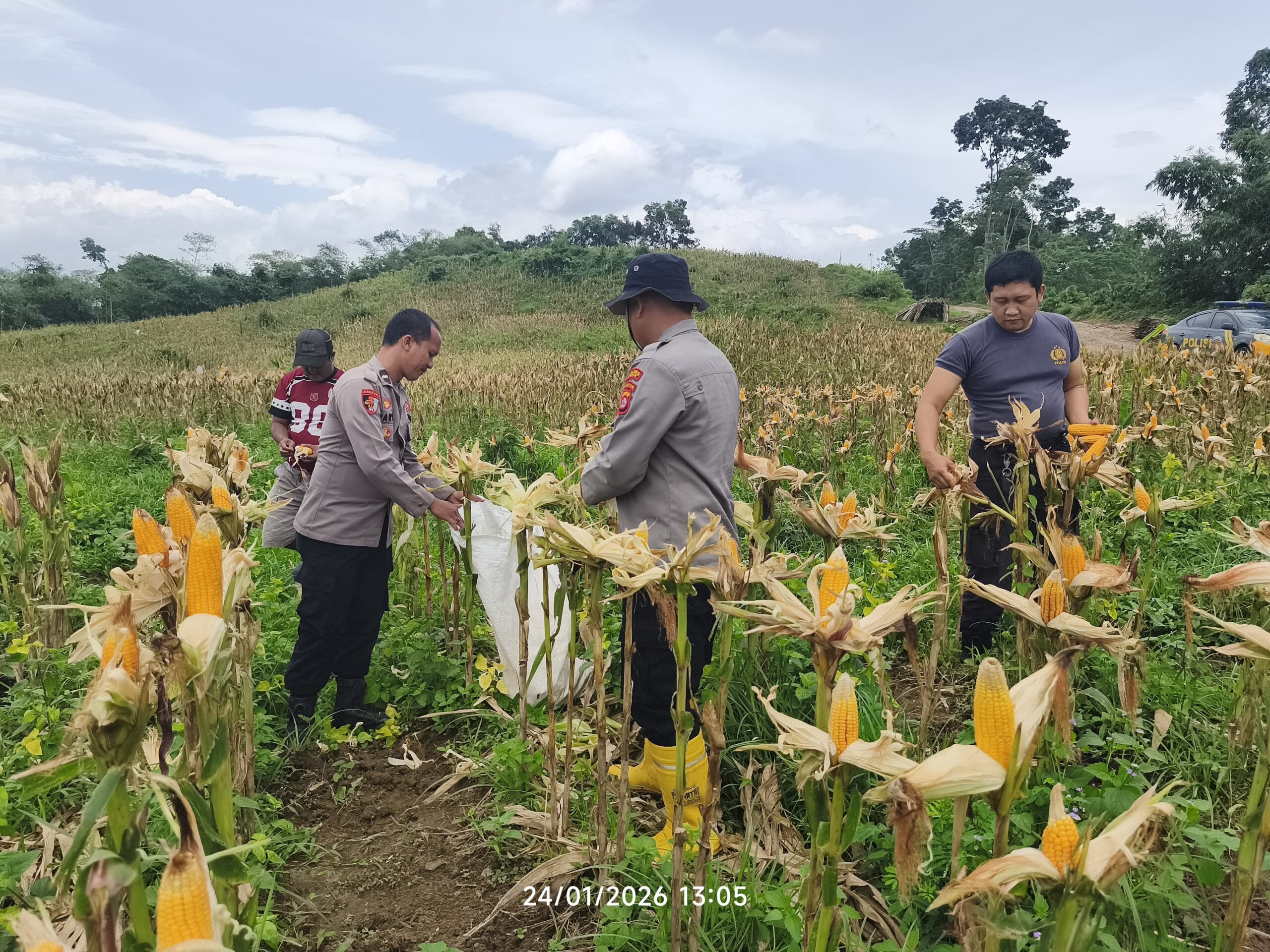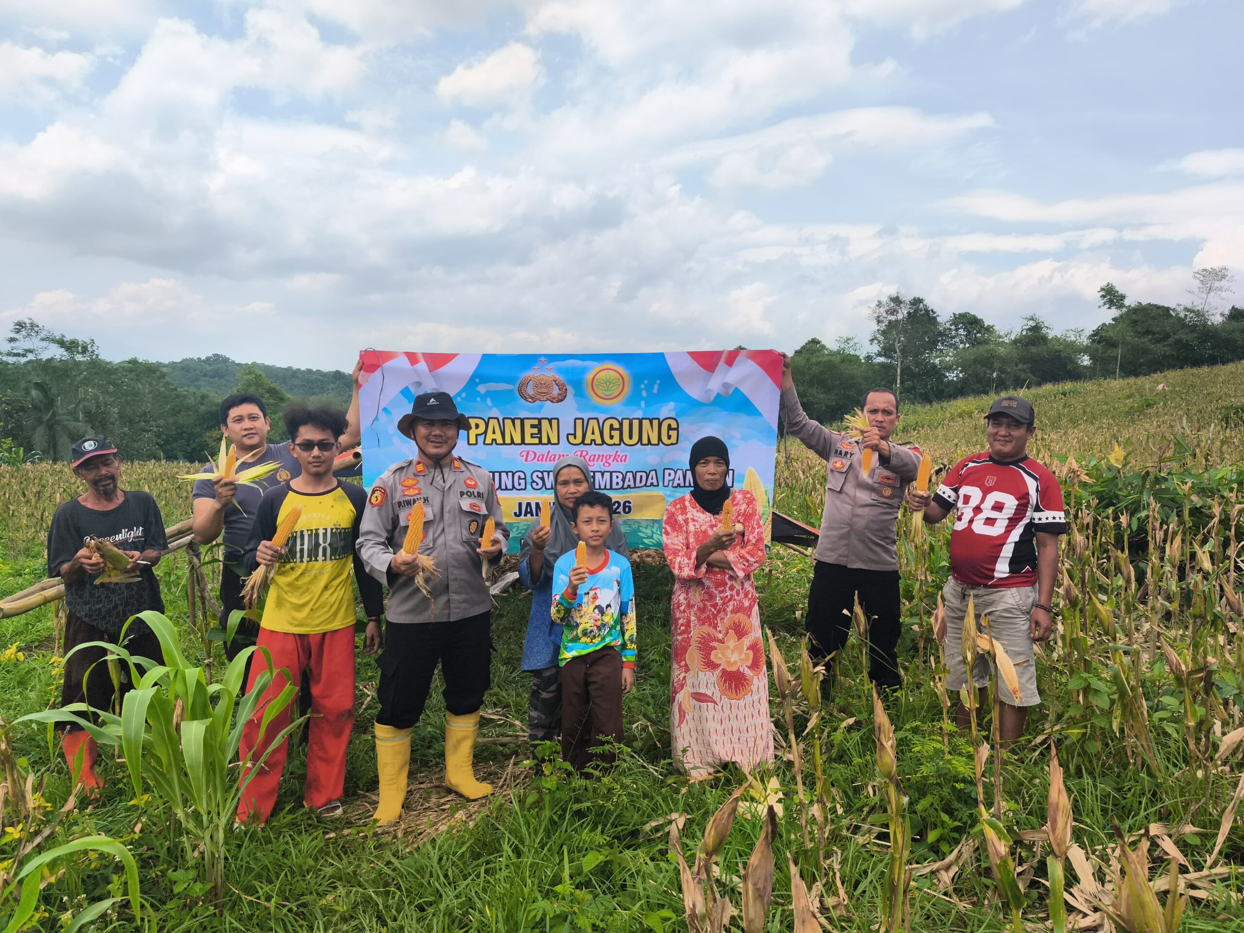Polsek Cimarga Polres Lebak Polda Banten Bersama Petani Desa Sarageni Melaksanakan Panen Jagung Hibrida