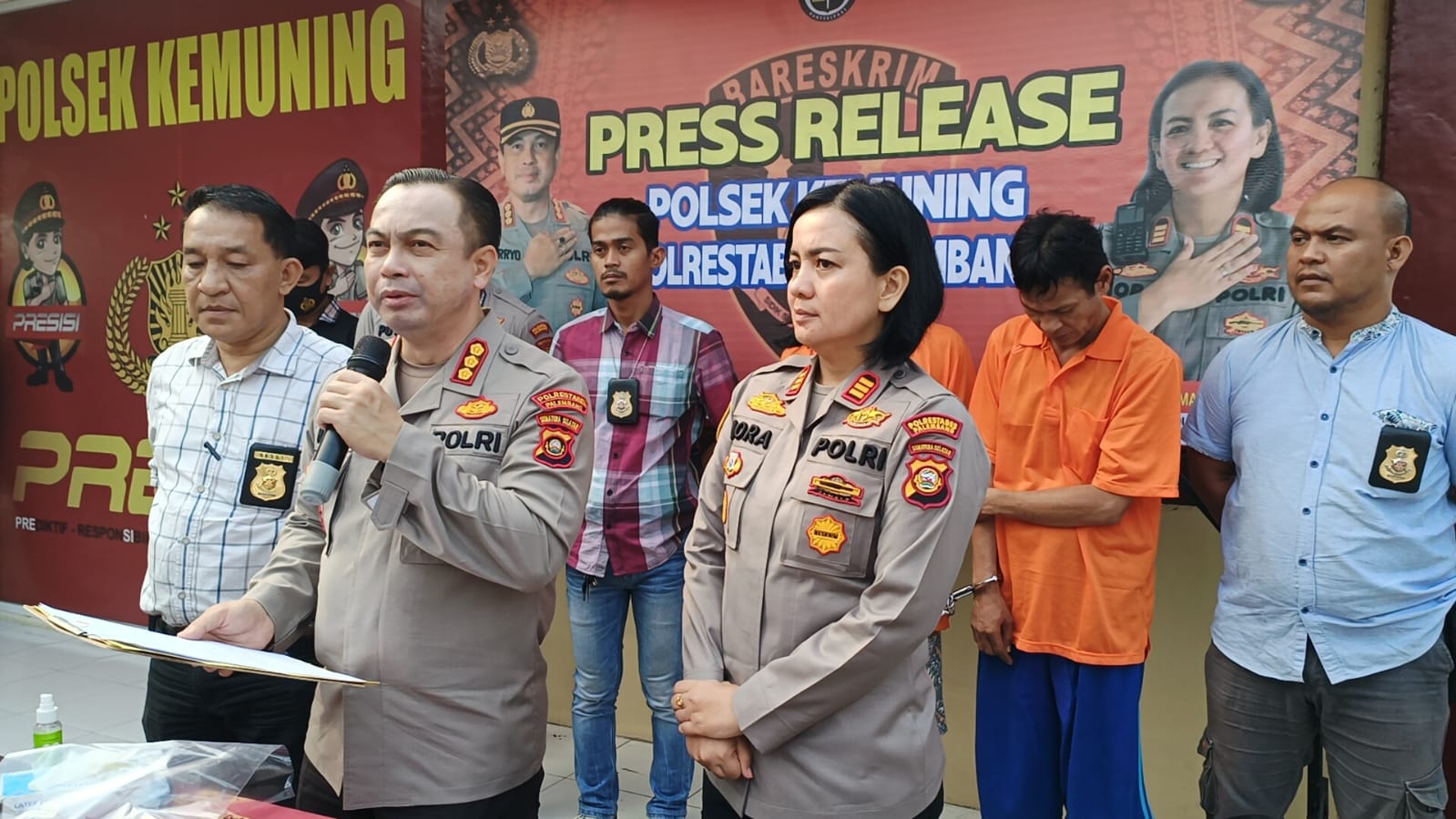 Liputanabn.com | Palembang – Press realese yang di gelar di Polsek Kemuning Palembang, Jum’at (29/09/23) dipimpin langsung Kapolrestabes Palembang Kombes Pol. Dr. Harryo Sugihhartono S.I.K MH, didampingi Kapolsek Kemuning AKP. Nora Marlinda SH., MH, dengan menghadirikan kedua tersangka.