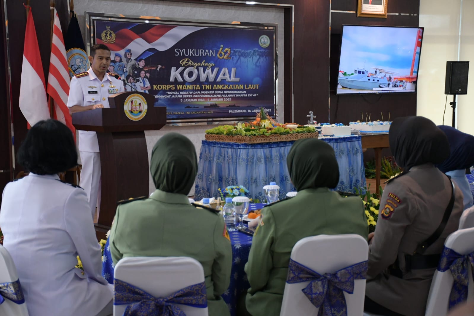 Liputanabn.com | Palembang – Pakor Polwan Polda Sumsel AKBP Sinta SIK menghadiri syukuran Hari Ulang Tahun (HUT) Korps Wanita Angkatan Laut (Kowal) ke-62 yang digelar Pangkalan TNI angkatan Laut Palembang di ruang Sultan Mahmud Badaruddin (SMB) II Markas Komando (Mako) Lanal Palembang, Kamis (16/1/25)