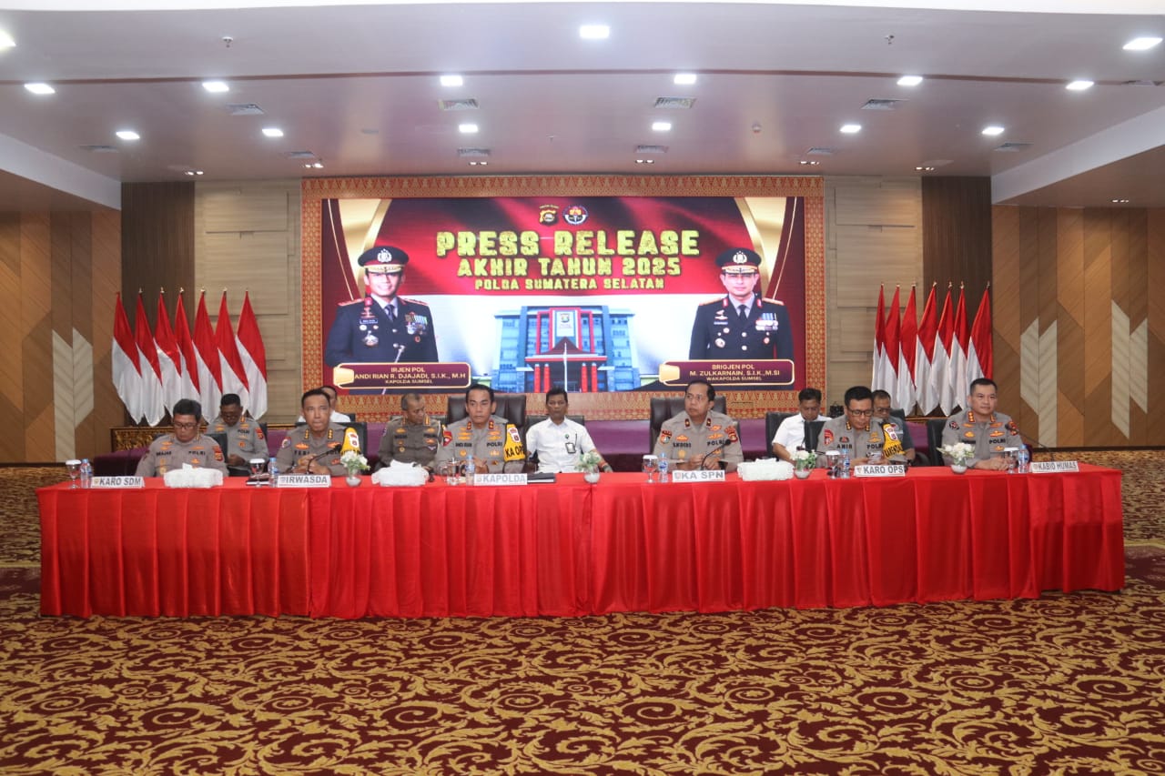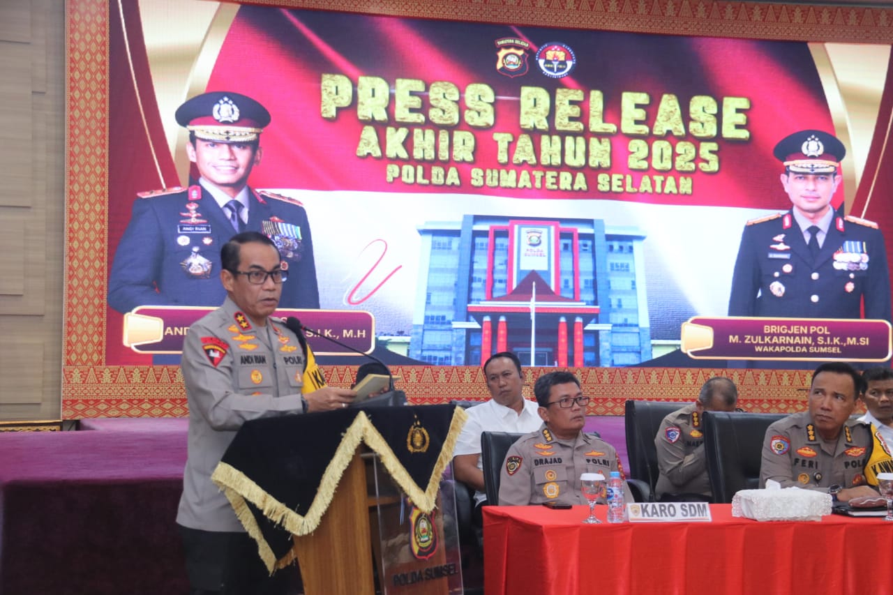Liputanabn.com | PALEMBANG – Kepolisian Daerah Sumatera Selatan menggelar rilis akhir tahun 2025 untuk memaparkan capaian kinerja dan evaluasi situasi keamanan dan ketertiban masyarakat selama satu tahun terakhir. Kegiatan ini dipimpin langsung oleh Kapolda Sumsel Irjen Pol Andi Rian R. Djajadi, S.I.K., M.H., sebagai bentuk akuntabilitas publik dan transparansi institusi.