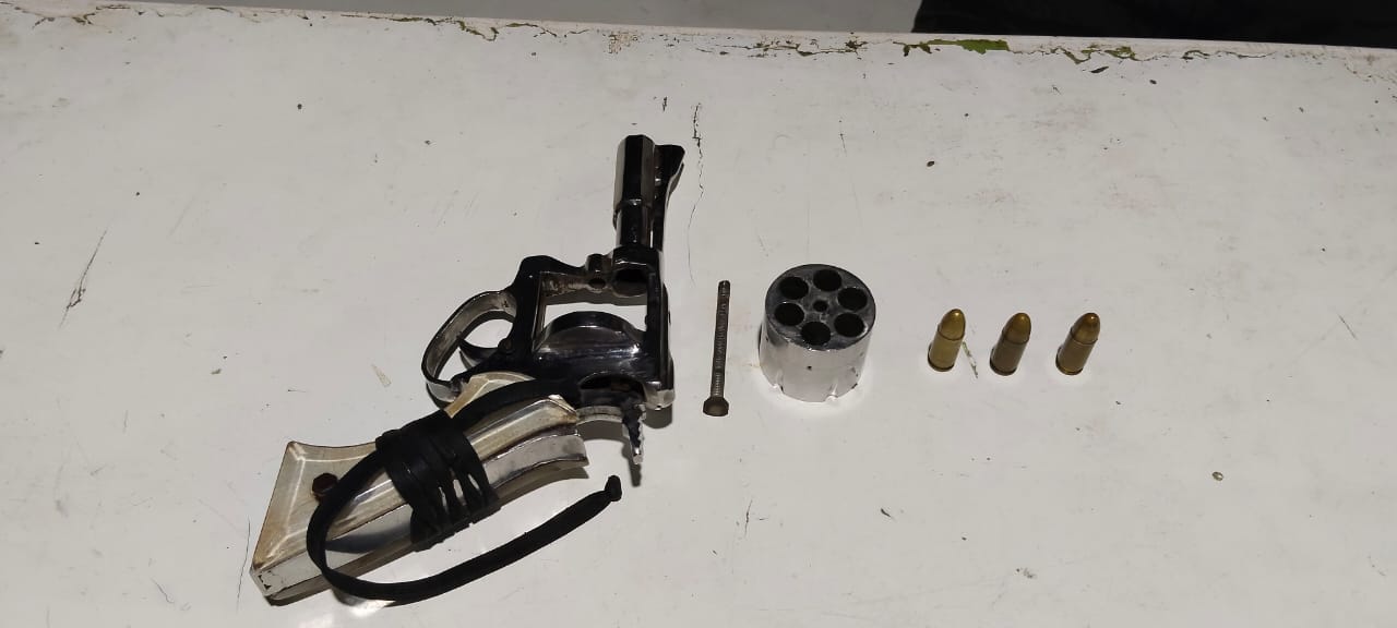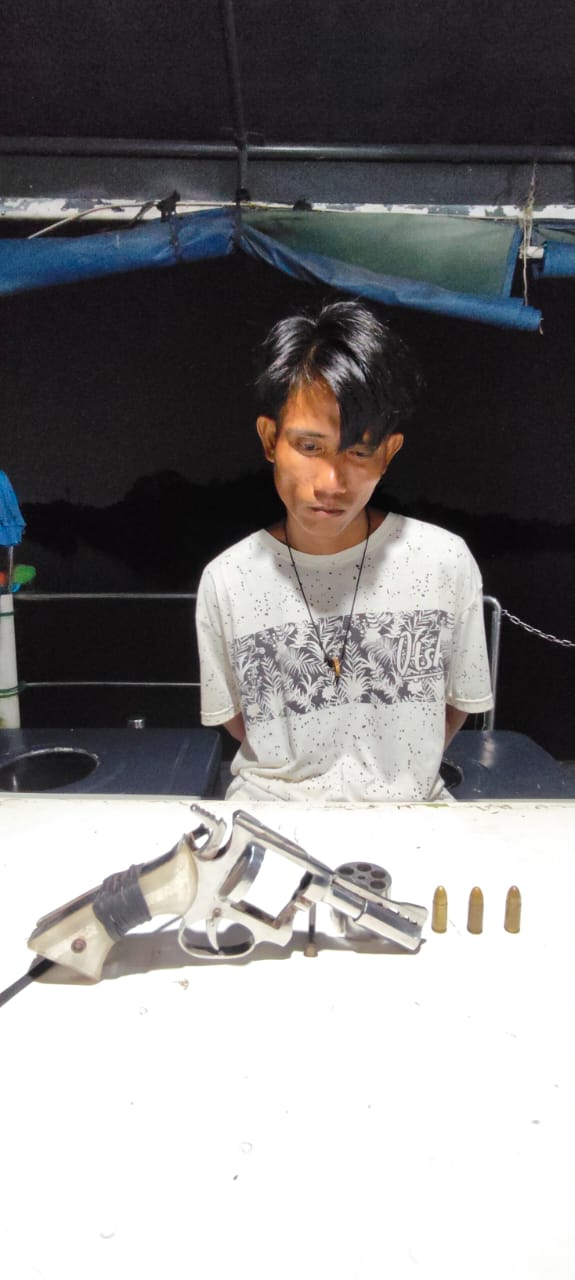 Saat diminta untuk mengangkat bajunya, tim menemukan satu pucuk senjata api rakitan berwarna silver dengan silinder enam butir, berikut tiga butir peluru kaliber 9 mm, terselip di pinggang kiri pelaku.
