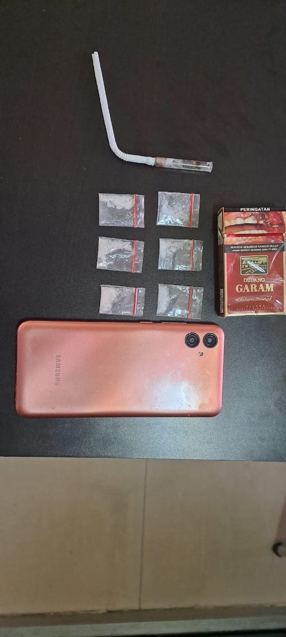 Dengan barang bukti yang ada padanya 1 (Satu) bungkus bekas rokok filter berisikan 6 (Enam) bungkus plastik bening masing-masing berisikan kristal putih diduga narkotika golongan I jenis Sabu dengan berat brutto : 1,85 Gram, 1 (Satu) buah pipa kaca bekas pakai dan 1 (Satu) unit handphone merek Samsung warna merah
