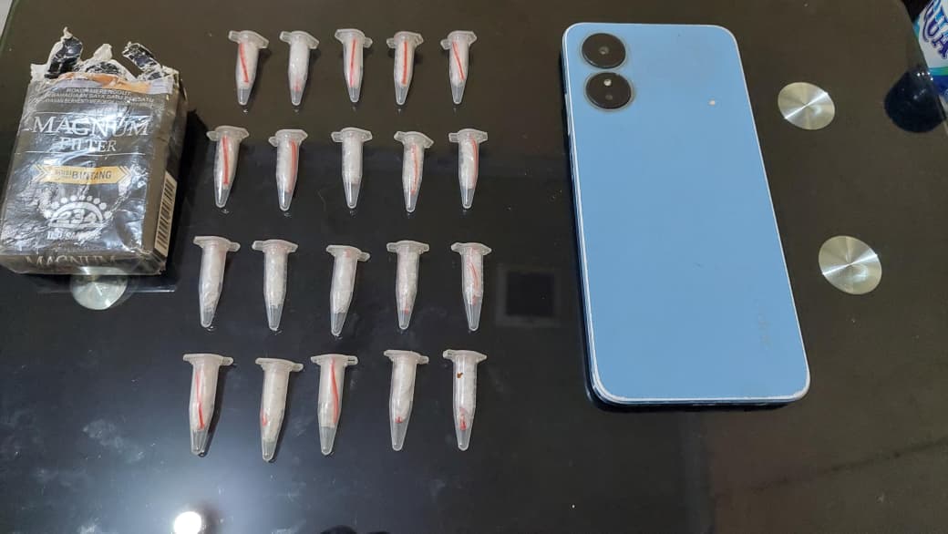 Dari hasil penggeledahan, petugas menemukan barang bukti berupa 1 bungkus bekas rokok yang berisi 20 paket plastik bening berisikan kristal putih yang diduga narkotika golongan I jenis sabu, serta 1 unit handphone merek Oppo warna biru.