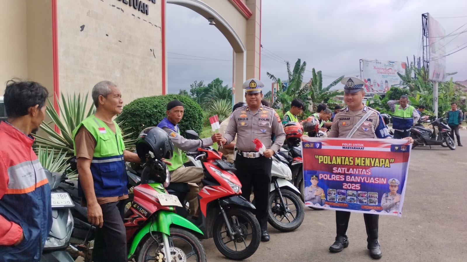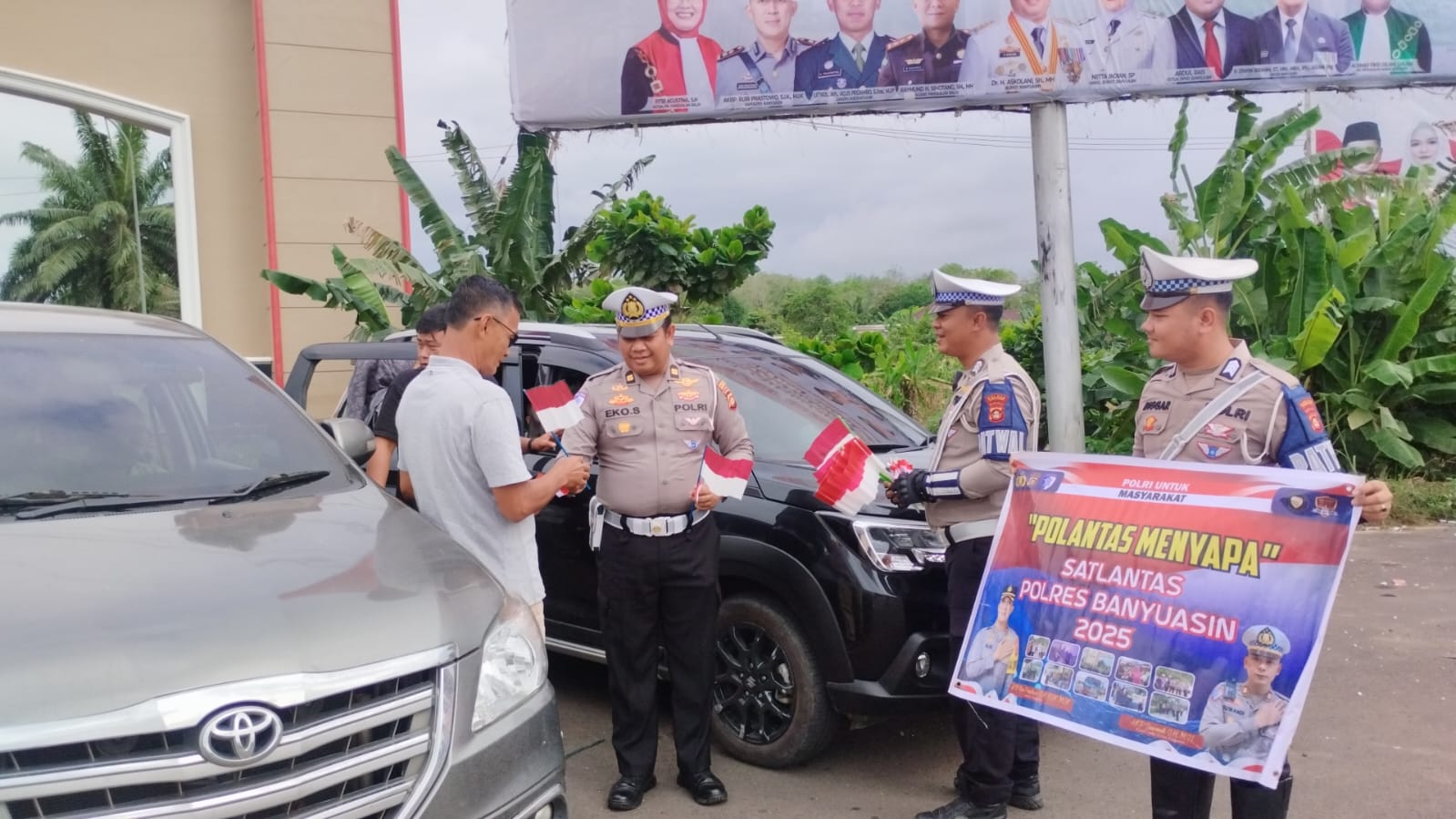 Satlantas Polres Banyuasin Pasang Bendera Merah Putih Pada Kendaraan dan Bentangkan Spanduk Polantas Menyapa