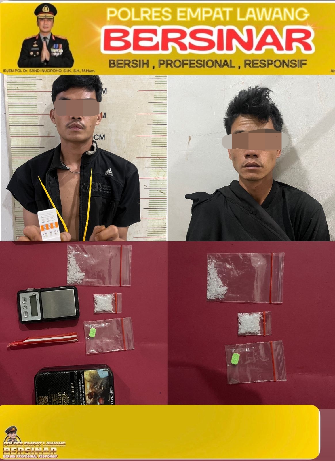 Dua tersangka yang diamankan masing-masing berinisial NS (28), seorang petani warga Muara Pinang, dan WF (21), seorang pengangguran warga Kecamatan Lintang Kanan. Penangkapan dipimpin langsung oleh Kasat Resnarkoba bersama Kanit Idik 2 Satresnarkoba.