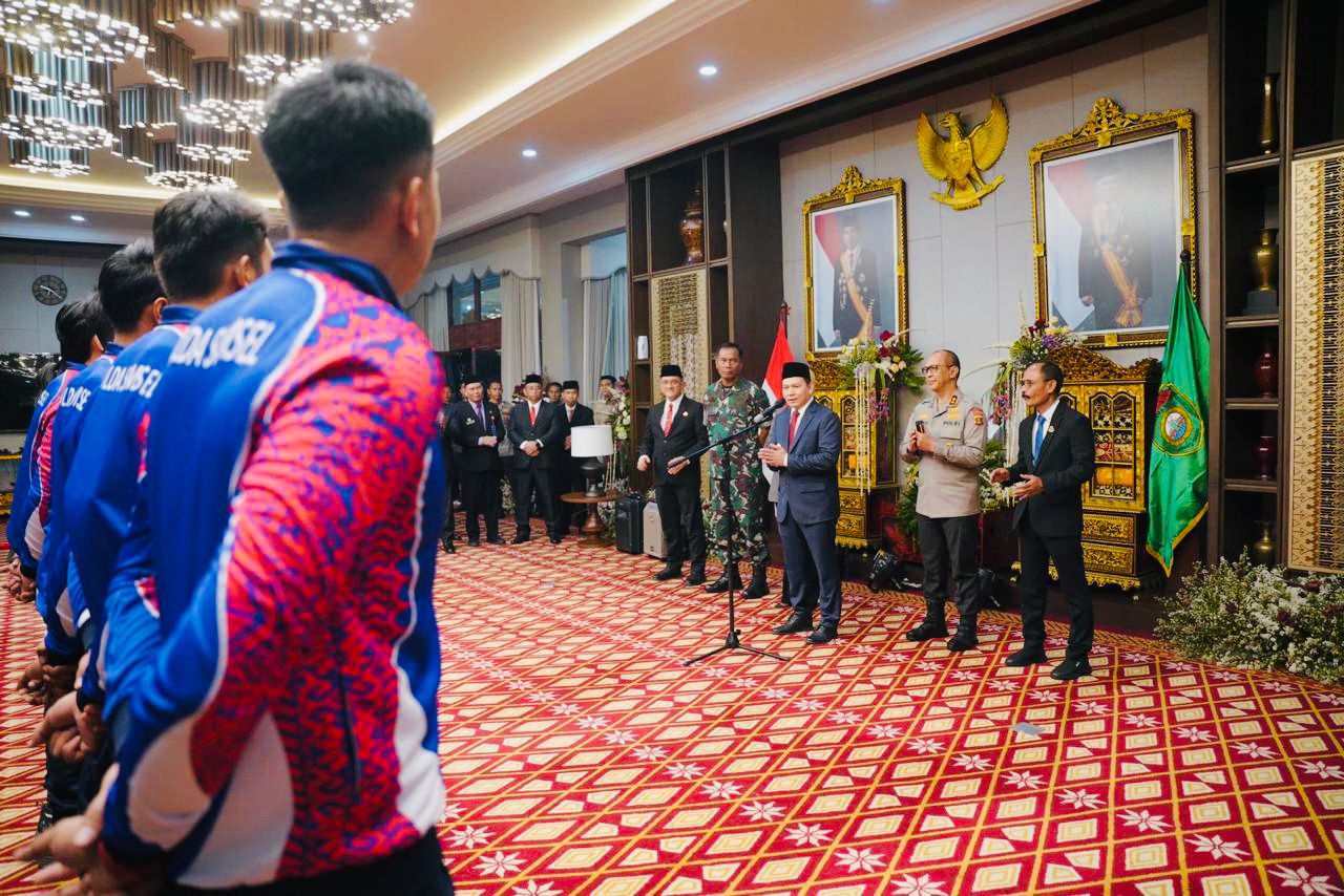 Liputanabn.com | PALEMBANG – PJ Gubernur Elen Setiadi didampingi Kapolda Irjen A Rachmad Wibowo, Ketua DPRD Hj R A Anita Noeringhati, Kasdam II Sriwijaya Brigjen TNI Aminton Manurung dan Dirlantas Kombes M Pratama melepas keberangkatan tim bola voli putra dan putri Sumatera Selatan di Griya Agung Palembang, Minggu pagi, (18/8/2024).