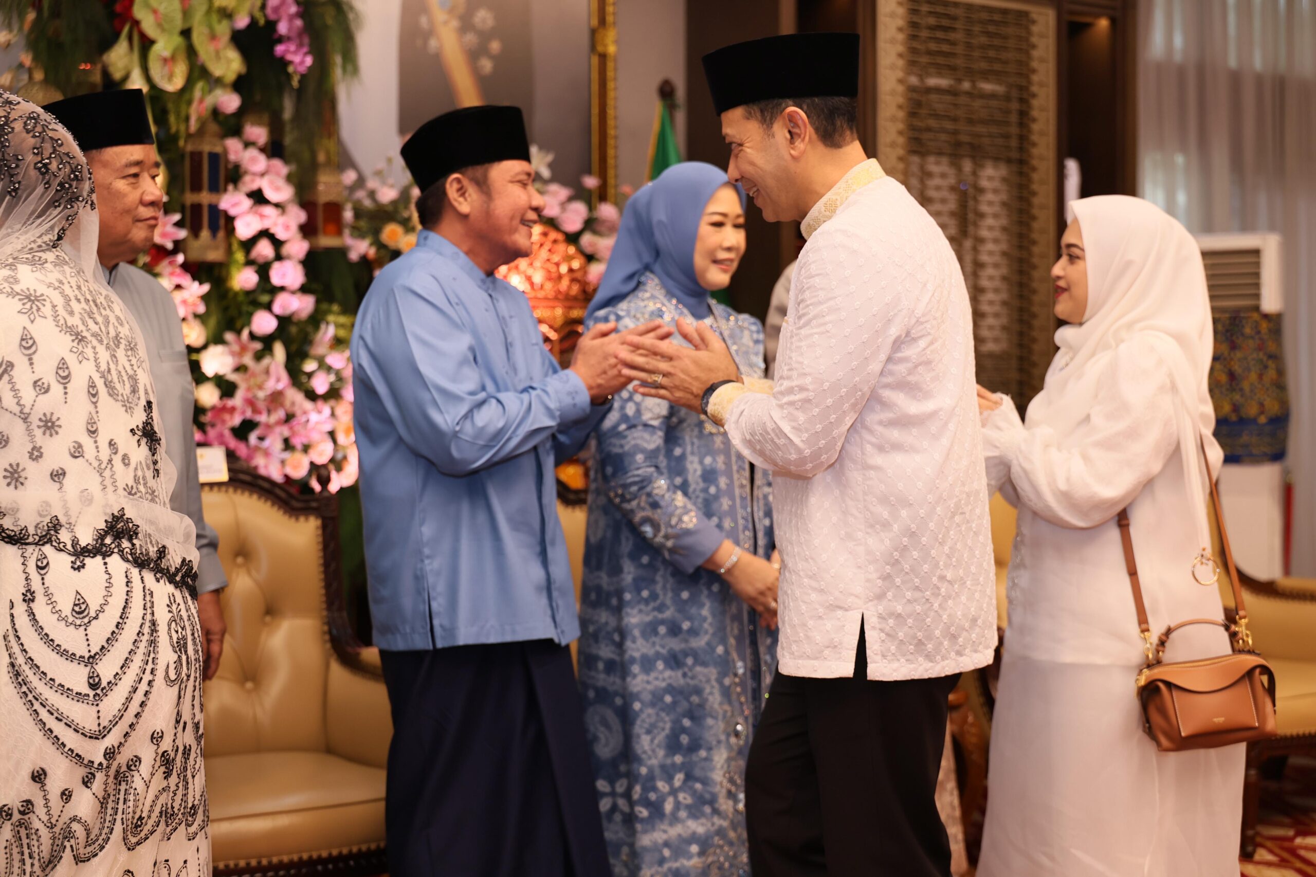 Liputanabn.com | Palembang,- Kapolda Sumsel Irjen Pol. Andi Rian R Djajadi SIK MH Wakapolda Brigjen Pol. M.Zulkarnain,SIK MSi Ketua Bhayangkari Sumsel Ny Dewwy Andi Rian bersama Wakil ketua Ny Monika Zulkarnain dan Pengurus lainnya serta pejabat utama Polda Sumsel, Senin (31/03/2025) siang menghadiri Halal Bihalal dengan Forkopimda Sumsel dan tokoh masyarakat di Griya Agung jalan Demang lebar daun Palembang