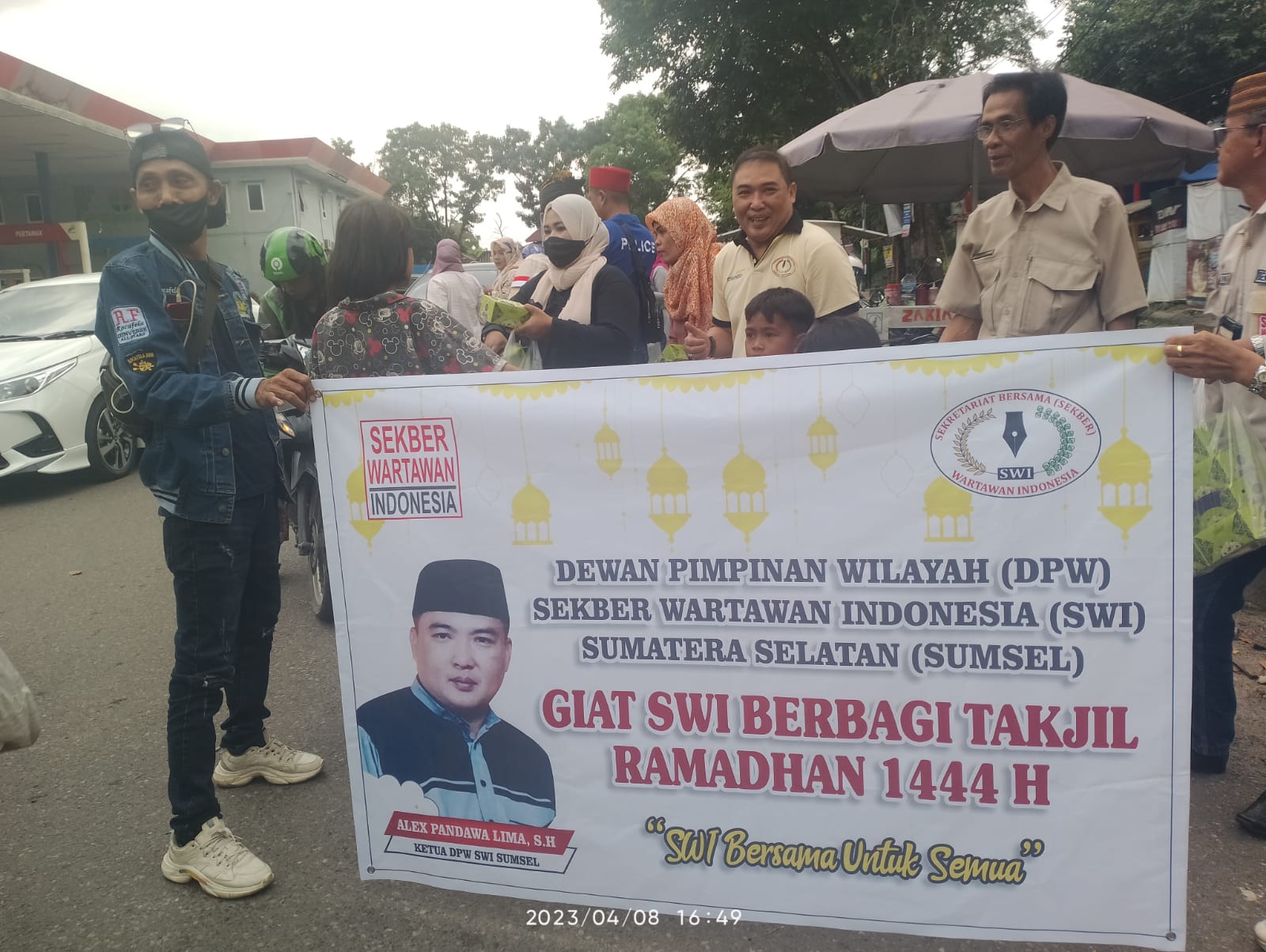 Liputanabn.com | Palembang – Di bulan suci Ramadhan 1444 H Sekretariat Bersama Wartawan Indonesia (SWI) DPW Sumatera Selatan melakukan bakti sosial dengan membagikan takjil ke sejumlah pengendara yang melewati Jalan Demang Lebar Daun Palembang, Sabtu 8 April 2023.
