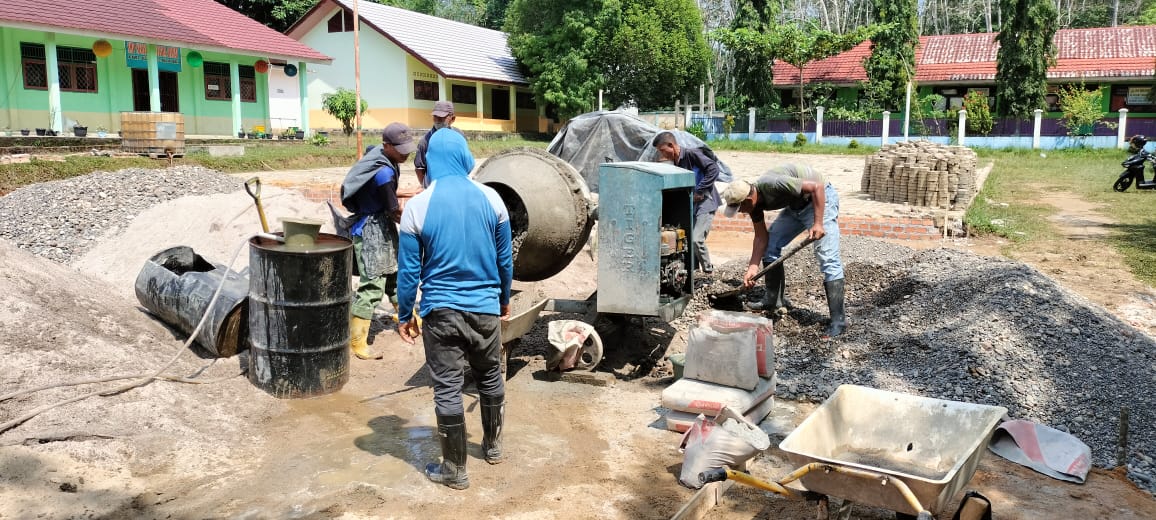 Tampak juga terlihat bangunan lapangan bola basket yang sedang berlangsung saat ini terlihat satu persatu mobil membawa material yang menurunkan bahan material secara perlahan-lahan dengan menggunakan molen