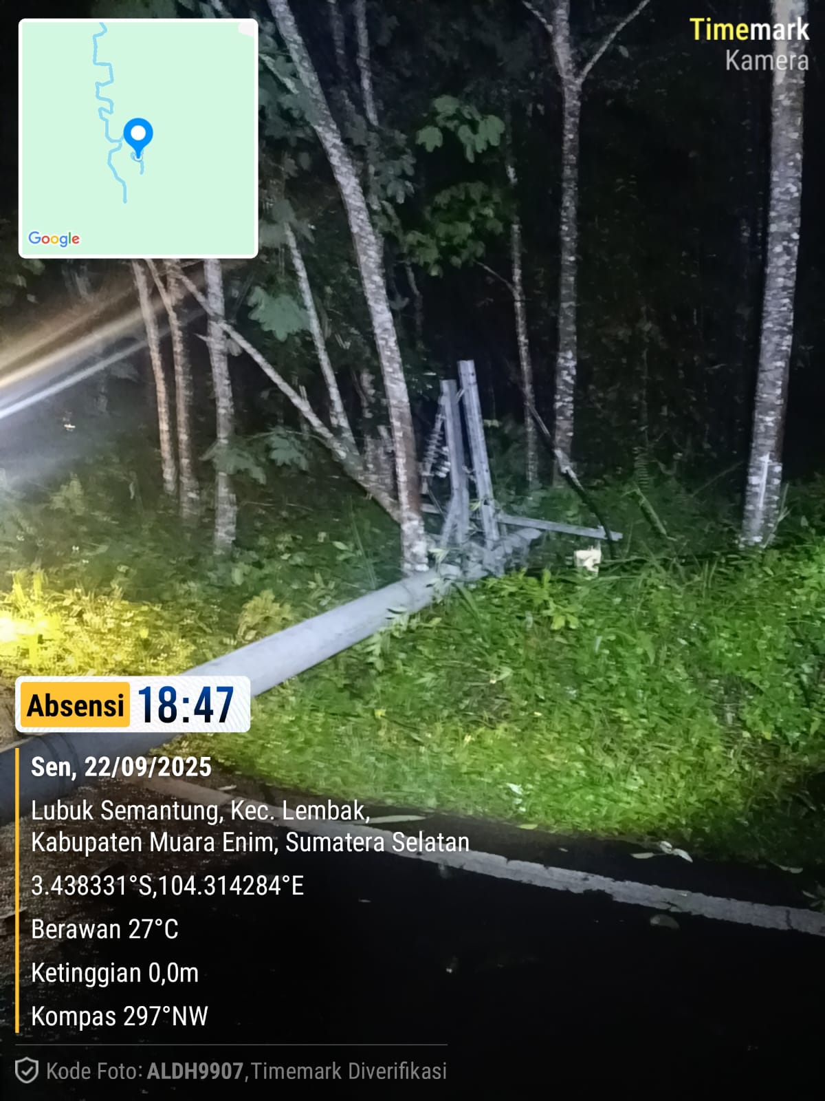 Liputanabn.com | Muara Enim, 22 September 2025 — Sebuah tiang listrik di Lubuk Semantung, Kecamatan Belida Darat, Kabupaten Muara Enim, roboh akibat hujan deras disertai angin kencang pada Senin sore. Kejadian ini sempat menimbulkan kepanikan warga setempat dan menyebabkan pemutusan aliran listrik.